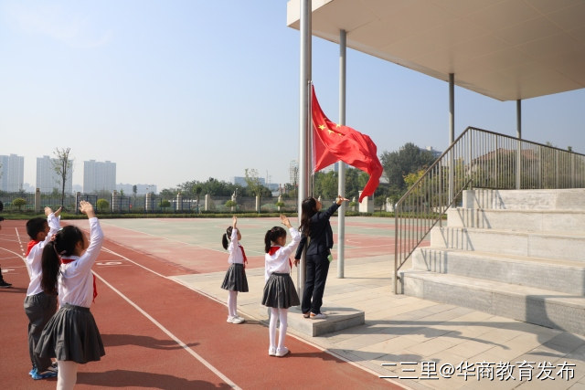 升旗仪式上,伴随着雄壮的《义勇军进行曲》,鲜艳的五星红旗冉冉升起,迎风飘扬。学生们面朝国旗、高唱国歌、祝福祖国。